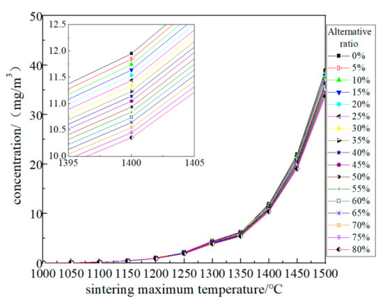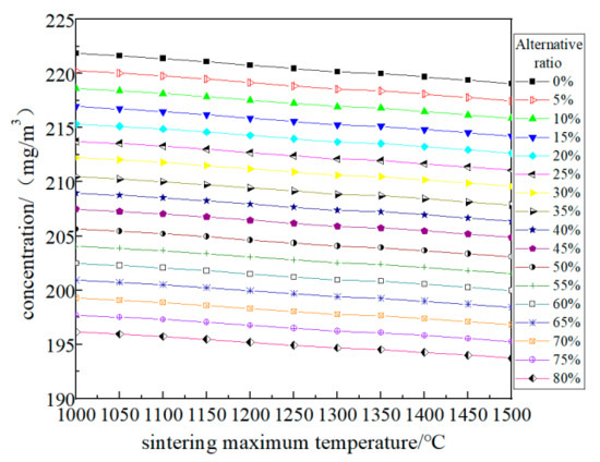 Figure 10 shows the CO concentration changes with the increase of the sintering maximum temperature under the different substitution ratios of straw charcoal. At a low sintering maximum temperature, the CO concentration is basically unchanged with the different substitution ratios of the straw charcoal, with a very small CO amount. As the temperature rises, the CO concentration increases rapidly, and it can reach about 40 mg/m3 at 1500 °C. At the higher sintering maximum temperature, the increase of the substitution ratios can reduce the CO concentration, but just lightly.