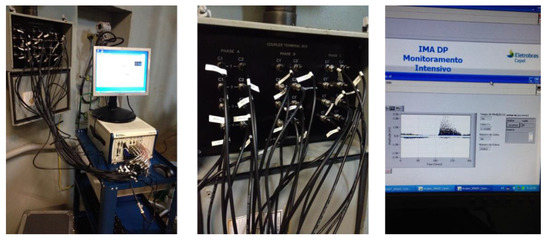 Figure 1 shows, on the left side, a general overview of the measurement arrangement, highlighting, in the middle picture, the terminal box, which is accessing the partial discharge signals emitted by the couplers installed along the stator windings. The coaxial cables make contact at these terminals and the other ends are inserted in an oscilloscope. The oscilloscope output is connected to the computer where the software performs the signals’ filtering. On the right of Figure 1, a PRPD map of the partial discharge signal from one of the measuring terminals is presented.