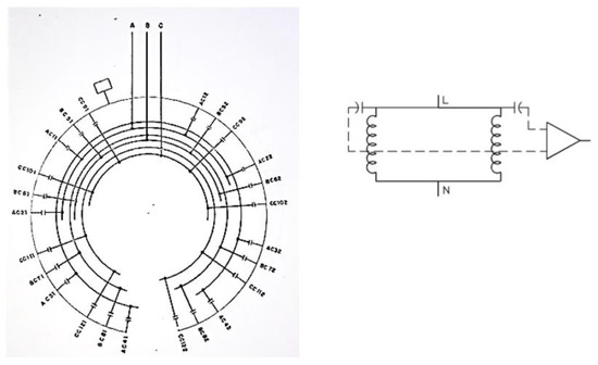The coupler’s location along the stator windings is shown in Figure 2, which is an image taken from the Eletronorte Eletrobras Electric Generation Utility installation manual, together with the differential installation model presented in the IEEE 1434-2014 standard. However, although the type of installation already had noise removal, it was still necessary to perform other computational filtering to obtain the signal as established by the standards, as described in Section 2.2.
