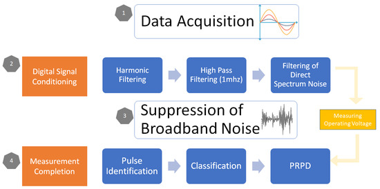 The digital signal processing used by IMA-DP, a PD acquisition system developed by CEPEL [26], can be described in seven distinct steps in order to remove noise and obtain a partial discharge signal as accurately as possible, reproducing the electric machine operating condition, according to [26,27]. In these steps, two processes are established: the digital signal conditioning through filters and the measurement completion provided to the user, shown in Figure 4.