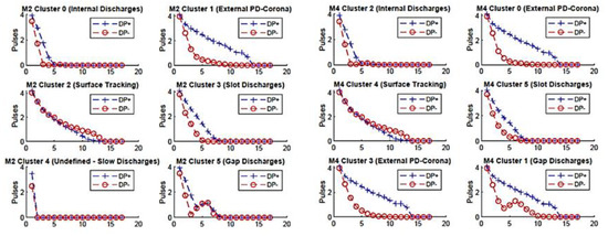 Continuous clustering models were initially executed to identify how many clusters would be identified. However, based on the history knowledge of the generator studied, six discharge groups were chosen, representing five discharge patterns defined by norm and one for low levels of partial discharge, which did not present a defined pattern.