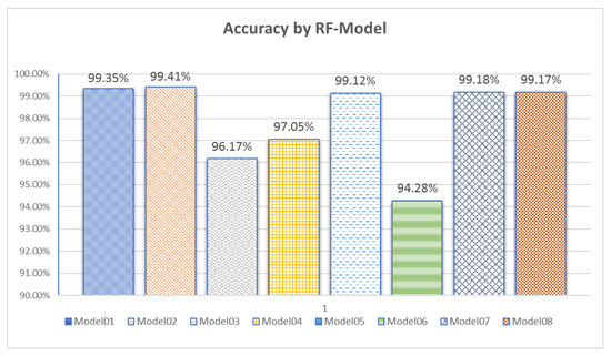 Figure 8 shows the results of the eight trained RFs, also presenting the RFs’ models hit percentages in the test-training stage. It was possible to note that the RFs that were trained with labels generated by the models that presented better results in the indexes for clustering evaluation also presented hit percentages higher than 99%, while the hit percentages of RFs that resulted from labels in which the clustering stage presented lower results also presented lower hit percentages (as, for example, model06 with a hit percentage of 94.28%). One case to be analyzed more carefully is model07. This model presented initially poor clustering-related indexes. However, in the patterns’ graphical analysis generated by model07 all patterns of PDs were present.