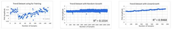 Figure 9 shows the results of the R2 analysis when analyzing the first PHA variable for model02, for an External-Corona PD. The low value characteristic of R2 = 0.0713 is remarkable. This characteristic comes from the nature of the data collected for the database creation. Analyzing the R2 characteristics of the other variables for the corona pattern, the low value of R2 is noted. However, when adding the characteristic of increased PD intensity, it is possible to notice the growth in the R2 value. With linear increase, the R2 increases significantly when compared to R2 in the initial database. It is also remarkable that the case R2 = 0.1314 with random variation is notably higher, with an increase rate of approximately 46% compared to R2 of the original database.