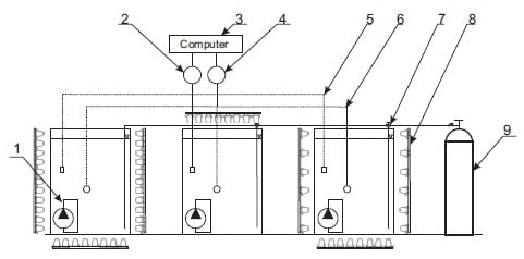 Scheme of the test bench: (1) circulation pump, (2) temperature meter, (3) computer, (4) photosynthetically active radiation (PAR) meter, (5) thermocouple, (6) PAR probe, (7) dosing regulator CO2, (8) lighting system, (9) CO2 feeding system. Source: own work.