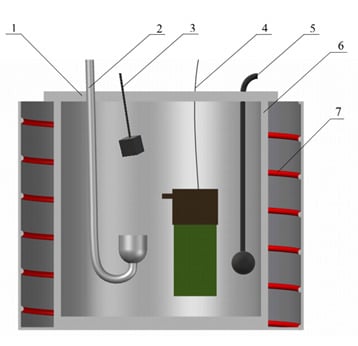 Technical illustration through a cross-section of an example PBR: (1) reactor cover, (2) diffuser feeding system, (3) temperature sensor PT100, (4) circulating pump Eden 128, (5) PAR probe, (6) glass reactor, (7) cylindrical LED light jacket. Source: own study.