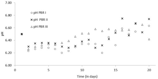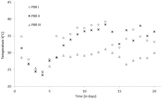 The average temperature of the culture ranged between 25 and 35 °C, although in extreme cases it reached 40 °C. The optimal temperature depends on a given species, although many authors state that for most representatives of this species it is between 20 and 30 °C [19,26,31]. Temperature fluctuations were related to the heat generated by the lighting during its operation in the 14/10 system. The stabilization problem will be eliminated in subsequent tests by removing heat from lighting systems and stabilizing the process temperature. Figure 5 contains a graph of the temperature distribution in the three photobioreactors during cultivation. The highest temperatures were obtained by photobioreactors equipped with cylindrical coats of light and lighting from the bottom panel rather than the photobioreactor illuminated only by light from above.