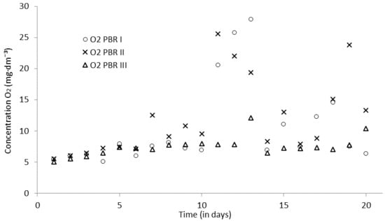The graph in Figure 4 contains the distribution of oxygen content over time. The concentration of oxygen, except between days 11 to 14, for all lighting systems was maintained in the range of 5 to 15 mg·dm−3. Between days 11 and 14, oxygen concentration was observed to rapidly increase by over 100% for both PBR I and PBR II, which correlated fully with the maximum increase in the number of cells for these photobioreactors at that time. Increased oxygen production was observed for PBR I and PBR II photobioreactors.