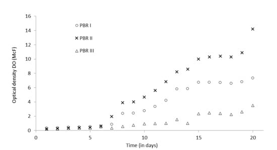 Optical density measurements were carried out using a densitometer operating in the range of λ = 565 nm ± 15. The absorbance results are shown in Figure 6. From the changes in optical density for different lighting systems, it can be concluded that the largest increase in biomass occurred in the PBR I photobioreactor, which was equipped with a single cylindrical mantle and a lighting panel on the lower surface. The smallest increase was visible for PBR III, which had a single light source on the upper surface. This suggests that, despite the provision of identical conditions of nutrition and mixing, the distribution of available radiant energy translates into the rate of its conversion into biomass and the productivity of the farm.