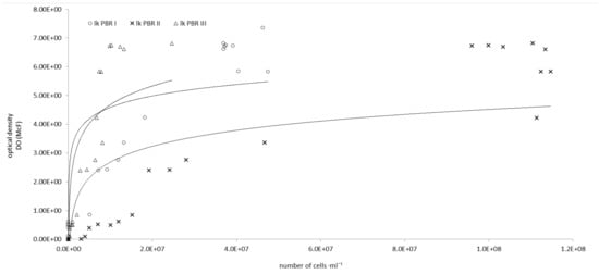 To determine the correlation between the number of cells and the optical density, the algae cells were counted under the microscope using the Thoma chamber. Next, the correlation between the optical density and the number of cells obtained from the cultures bred in reactors with different lighting systems was determined (Figure 7).