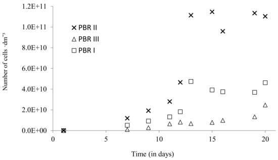 During experiments, the growth of algae biomass was studied over time. Figure 8 shows the increase in the number of algae cells of C. vulgaris BA0002a over time with respect to 0.001 dm3. The maximum daily increase in the number of cells for PBR I (the reactor in which a double light jacket and lighting from the bottom were used), which took place on the 13th day after inoculation of the culture, amounted to 2.93 × 1010 dm−3. For PBR II (with a single cylindrical mantle and lower lighting), the maximum daily increase in the number of cells was 6.48 × 1010 per dm3 and also took place on the 13th day of breeding. It was 50% higher than the results for PBR I. For PBR III, which was lit from the top, the maximum daily growth only took place on the 20th day after the establishment of the farm and was the lowest relative to the other two photobioreactors 1.13 × 1010 dm−3. The highest productivity of the algae cultures was obtained for integrated lighting in which the double light jacket and the bottom panel (PBR II) were placed.