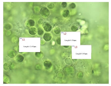 The mean diameter of the obtained cells on the last day of cultivation, measured with a Motic Red 233 optical microscope, was 9.75 µm (Figure 9).