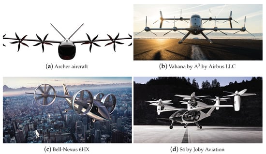 Examples of eVTOLs aircraft architectures (from https://evtol.news/aircraft): (a) Archer aircraft, https://www.flyarcher.com/; (b) Vahana by A3 by Airbus LLC, https://acubed.airbus.com/projects/vahana/; (c) Bell-Nexus 6HX by Bell, https://www.bellflight.com/products/bell-nexus; (d) S4 by Joby Aviation, https://www.jobyaviation.com/.