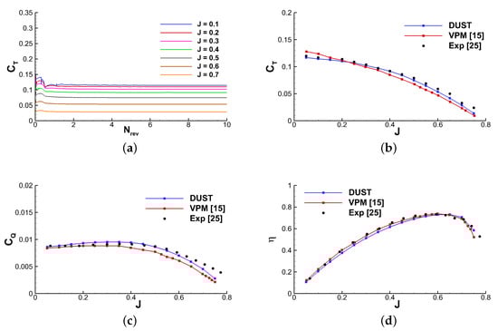 Comparison of the results obtained for the APC propeller, , . (a) Time histories of the thrust coefficient calculated by DUST as a function of the number of rotor revolutions ; (b–d) comparison of the DUST simulations results with the experimental data from McCrink and Gregory [24] and the numerical simulations results from Alvarez and Ning [16].