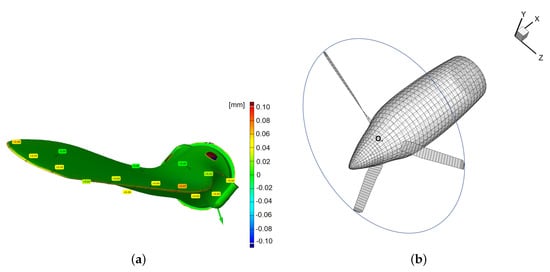 (a) Geometry of the Varioprop 12C propeller blade; the coloured bar indicates the error in mm between the reconstructed CAD geometry and the surfaces provided by the three-dimensional (3D) scanner. (b) Layout of propeller numerical model and reference system.
