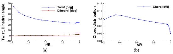 Geometrical description of the Varioprop 12C propeller blade. a Twist and dihedral angle distributions along the spanwise radial coordinate; b chord distribution along the spanwise radial coordinate.