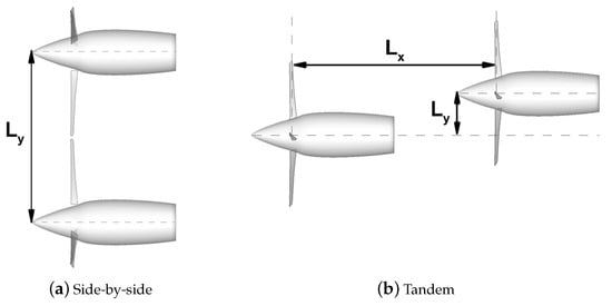The numerical activity was focused on the study of two propellers in both tandem and side-by-side configurations in forward flight, with particular attention on the typical cruise flight velocity of eVTOL urban air mobility vehicles that can be considered in the order of 100 km per hour (i.e., = 28 m/s). In all of the simulations, the rotational speed of both the propellers was fixed to 7000 RPM to reproduce the full-scale tip Mach number () of a eVTOL aircraft in cruise [2]. The Reynolds number calculated on the base of the propeller disk diameter and on the rotational velocity evaluated at 70% R is . The blade pitch angle at 75% of the rotor radius was fixed to for both the interacting propellers. In order to reproduce cruise flight conditions of eVTOLs, the simulations were performed with the propellers aligned to the freestream velocity vector. In the following, the longitudinal distance along x axis between the rotor disks planes is defined as , while the lateral distance between the propellers shaft axis is defined as , as shown in the layout of the interacting configurations presented in Figure 5.