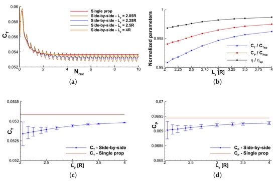 Figure 6a shows the time histories of the thrust coefficient calculated for the counter-clockwise rotating propeller in side-by-side configuration (upper propeller of Figure 5a) at some different lateral distances as compared to the results that were obtained from the single propeller simulation.