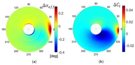 In order to provide a more detailed analysis of the local performance of the propeller blades at , Figure 7 shows the difference of the sectional lift coefficient and the effective angle of attack experienced by a propeller blade in side-by-side configuration with respect to the single rotor configuration that was computed during the last revolution.