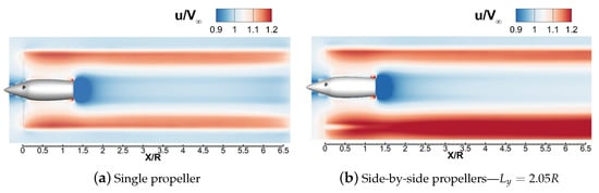 Detailed insight regarding the flow physics involved in the side-by-side aerodynamic interaction is provided by the analysis of the propellers wake computed for the configuration characterised by the greatest interaction () when compared to the single propeller condition. In particular, Figure 8 shows the contours of the average freestream velocity component (u) calculated over the last rotor revolution on the plane for the single propeller and side-by-side propellers with lateral separation distance .