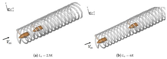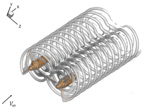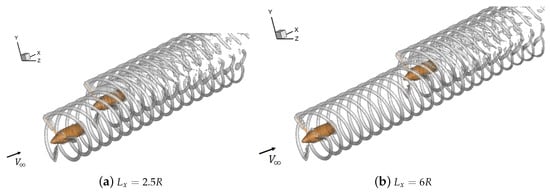 A more detailed understanding of the flow physics that are involved in the wakes interaction is obtained by the instantaneous flow field shown for the azimuthal angle in Figure 17 by means of the iso-surfaces of the instantaneous vorticity magnitude. This flow representation clearly shows that, for both of the considered distances , the interaction between the propellers wakes does not affect the coherence of the helical structure of vorticity released by the rear propeller. In particular, an increase of the iso-vorticity tubes is observed downstream the rear propeller due to the coalescence of the vortical structures that are released by the two co-axial propellers in tandem.
