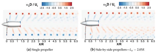 A more detailed analysis of this vortex interaction can be provided by the comparison of the contours of the in-plane vorticity shown on plane in Figure 9. The single propeller wake is characterised by the periodic shed of counter-rotating tip vortices that are dragged downstream by the freestream velocity and conserve their relative distance showing a slow rate of dissipation throughout the entire area of investigation, as can be observed in Figure 10a. For the side-by-side interaction case, the tip vortices were found to merge starting from the distance downstream the propellers disks and dissipate much faster with respect to the single propeller case. Indeed, starting from a distance of downstream the propellers disks, the vortices loose their coherent structures and they are nearly unrecognizable in the region of the wake between the propellers.