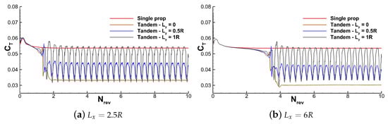 Time histories of the thrust coefficient computed for the single propeller and for the rear propeller (right propeller of Figure 5b) in tandem configuration at different longitudinal distances and lateral distances , , , .