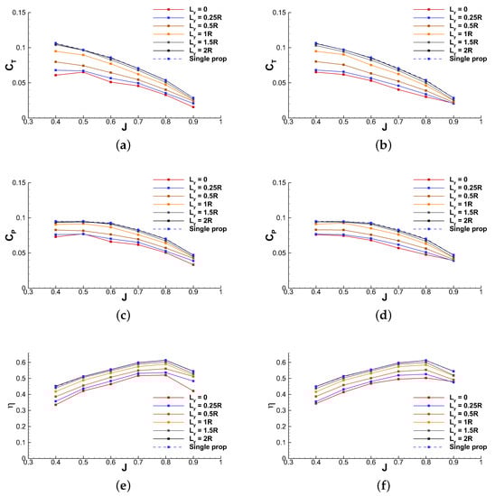 Results of the numerical simulations for the tandem propellers configuration. Thrust coefficient (), power coefficient () and propulsive efficiency of the rear propeller (right propeller of Figure 5b) as function of the advance ratio (J), , ; (a,c,e) , (b,d,f) .
