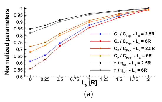 A more detailed analysis of the rear propeller performance in tandem configuration is provided in the following for , the advance ratio corresponding to the freestream velocity considered as the target cruise velocity of urban air mobility eVTOL aircraft. In particular, Figure 13a shows the normalised thrust coefficient , power coefficient , and propulsive efficiency of the rear propeller with respect to the corresponding parameters that were evaluated from the single rotor simulation. The effect of the rotor-rotor interaction on rear propeller performance is further when the degree of overlapping between the rotor disks increases, while the interactional effects become negligible when the lateral separation distance is equal to the propeller diameter (). In particular, the higher loss of performance due to the interaction is observed when the propeller disks are completely overlapped (), where a decrease of about 45% and of more than 30%, respectively, of the thrust and power coefficients is observed for the rear propeller at with respect to the single propeller case. These losses lead to a reduction of about 20% of the propulsive efficiency of the rear propeller in the same tandem configuration. The effect of a lower longitudinal separation distance between the propellers is a slight decrease of the performance loss in the order of few percents of both the thrust and power coefficients of the single propeller. Indeed, for the tandem configuration with , a reduction of 15% of the propulsive efficiency is observed. Moreover, Figure 13a shows that, for both the longitudinal distances between the propellers, the gradient of the performance loss is higher in the spatial range between and .