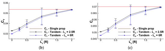 In order to analyse the effect of this aerodynamic interaction on the behaviour of the rear propeller loads over a rotor revolution, Figure 13b,c show the averaged and curves calculated at for both the longitudinal distances with errorbars representing the standard deviation of the coefficients computed over the last three revolutions. The amplitude of the loads fluctuations is higher when the lateral separation distance between the propellers is , as can be observed from these figures. In particular, for this tandem configuration, the loads fluctuation amplitude is an order of magnitude higher than the largest value that was observed in the side-by-side configuration. The loads fluctuations level of the and decreases when the degree of overlapping between the propellers disks increases and become negligible when the propellers disks are completely overlapped. Moreover, for lateral separation distances higher than , the thrust and power coefficients of the rear propeller in tandem approach the values of the single propeller configuration, while the loads fluctuations amplitude decreases.