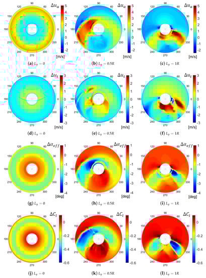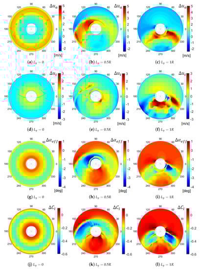 A better insight of the effects of the aerodynamic interaction on the propeller performance already discussed is provided by Figure 14 and Figure 15, showing the distributions of the differences of the axial velocity , tangential velocity , effective angle of attack , and sectional lift coefficient of a rear propeller blade in tandem configuration with respect to the single rotor configuration computed during the last revolution. In particular, this analysis was performed for the test cases with lateral distances , showing the greatest interaction effects on the rear propeller aerodynamic performance, as shown in Figure 13.