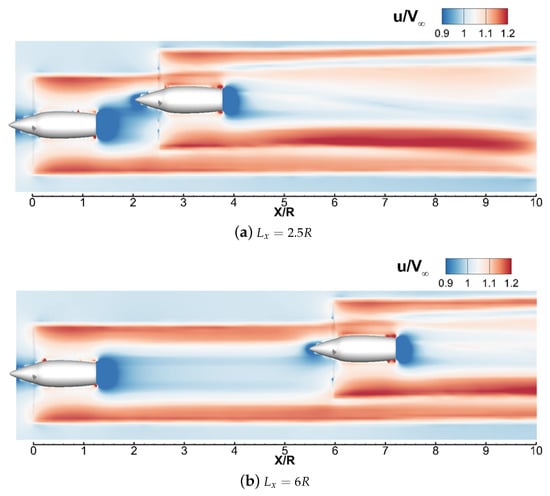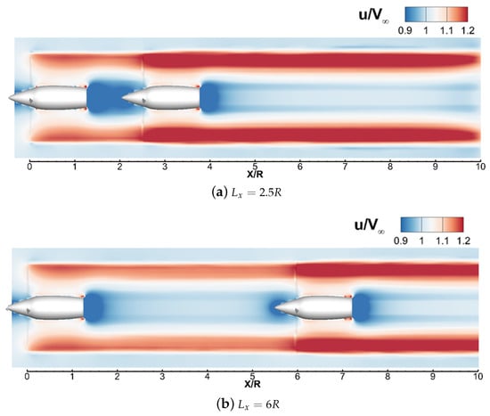 Comparison of the averaged freestream velocity component computed on the x − y plane for the tandem propellers configurations with Ly = 1R, θ = 25.5°, Mt = 0.32, J = 0.8.