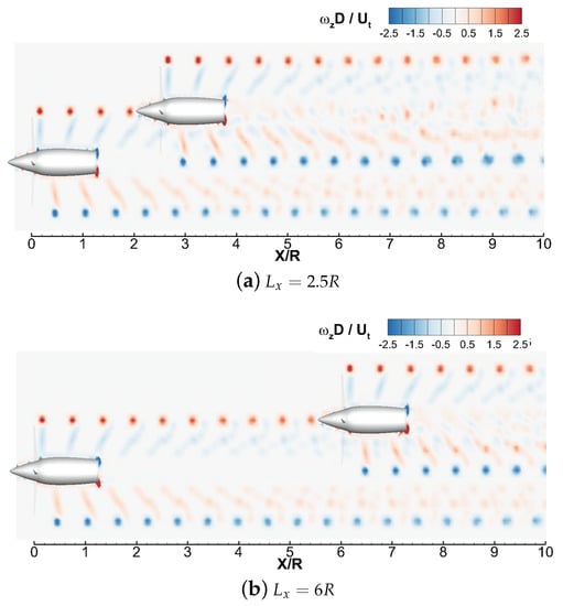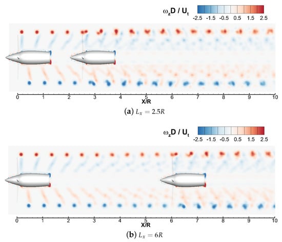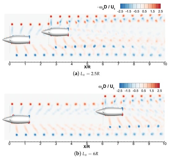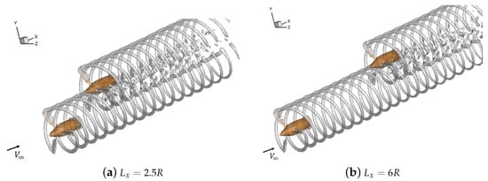 Because, in the present simulations, the blades of the propellers in tandem are co-rotating and synchronised, the tip vortices shed by the front propeller blades interact with the ones released by the rear propeller providing downstream the rotor disk co-rotating vortical structures that are characterised by higher vorticity and larger core. This feature is observed for both the longitudinal distances analysed, but for the resulting vortical structures show a higher level of vorticity with respect to the configuration with . Indeed, the vortices released by the front propeller blades are less dissipated when they interact with the ones released by the rear propeller, due to the lower longitudinal distance between the propellers. This feature is highlighted by the higher intensity of red that characterise the representation of the vortex investing the tip region of the rear propeller blade for with respect to the test configuration with (see Figure 18a,b).