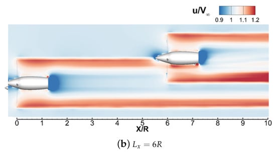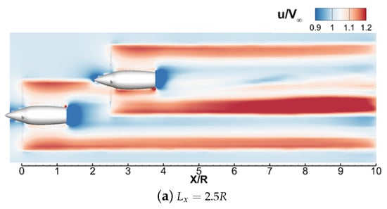 Global insight regarding the flow physics that are involved in the aerodynamic interaction for the investigated tandem configurations is provided by the following analysis of the propellers wakes computed at for the same lateral distances discussed before. For the test configuration with the propeller disks completely overlapped (), Figure 16 shows the contours of the average freestream velocity component (u) calculated over the last rotor revolution on the plane. The averaged flow fields clearly show that, for both the longitudinal distances , the wake of the rear propeller is quite faster at the tip region of the rotor disk with respect to the front propeller one. Indeed, the co-axial configuration of the two propellers provides a combination of the accelerated flow regions passing through the outer regions of the propeller disks.
