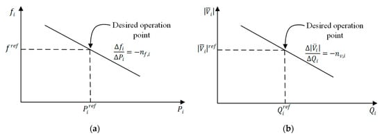 Given a set of inverters in a microgrid, the equations describing the conventional droop control of the inverter is given as [9,27]: