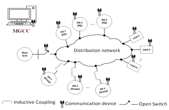 Notice that in Figure 2, all the droop-controlled DGs are coupled to the distribution network via an inductor to enable active and reactive power decoupling. A two-way communication network is assumed to exist between the MGCC and the various devices in the system to facilitate status probing and setpoint corrections by the MGCC. The higher-level control (secondary and tertiary levels) are assumed to be executed by the MGCC, which sends set points to the DGs via a communication network.