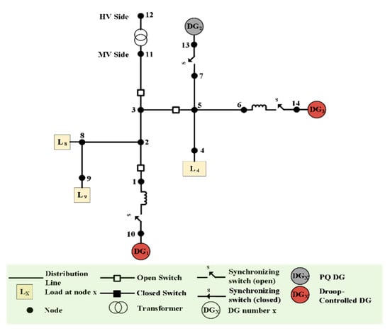 In multi-master mode, one or more grid-supporting DGs operating in droop mode are controlled to provide voltage reference for the system. Consider the 14-node distribution system in Figure 3 that needs to be restored after a blackout.