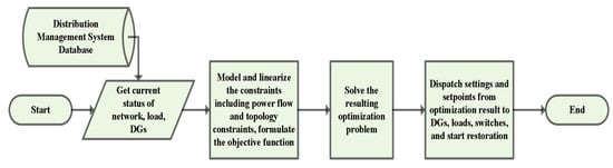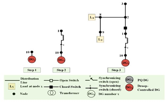 - The status of all branches should remain the same as the previous time step just before the synchronization step except for one branch that can connect the synchronizing DG to the system, that is, only the branch that connects the DG to the system is allowed to change from “OFF” to “ON” (Equation (22)) if it was not already energized.