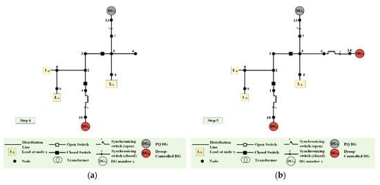 In step 4, the line between nodes 3 and 5 is energized, which automatically energizes nodes 4, 5, 6, and 7. In addition, DG 2 is synchronized to the system and load L4 is energized too. The topology of the microgrid in this step is shown in Figure 5a.