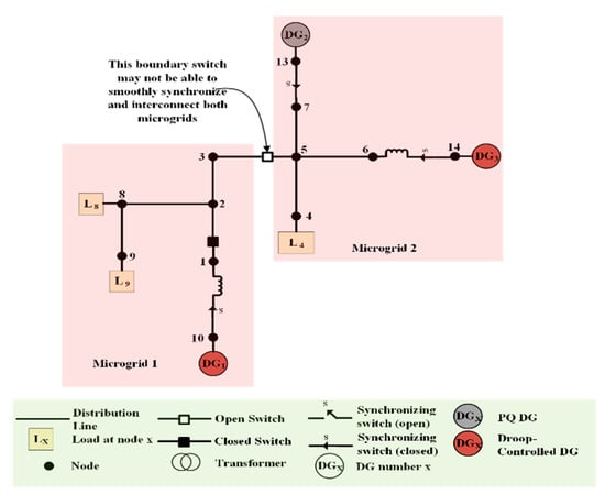 The goal is to restore the system and share the loads among the DGs. There are two three-phase grid-supporting DGs at nodes 10 and 14 which can act as a master for the system. There have been studies on sectionalizing distribution systems into multiple microgrids during restoration [13,15,16,17], however, interconnecting the multiple microgrids may become a challenge due to synchronization requirements, which we will show how to overcome below. Interconnected microgrids or forming larger microgrid will likely offer better reliability, load balancing, and energy coordination.