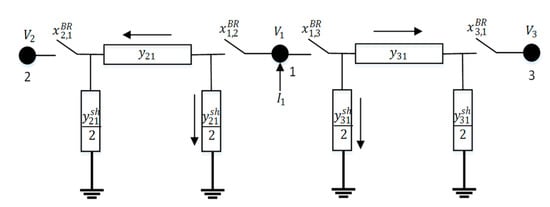 In Figure 8, there are three nodes labeled 1, 2, and 3, and each is assumed to be a three-phase node. This means that the voltage of each node, labeled , , and , are each complex vectors of length equal to three as well as the current injections. and are each a 3 × 3 complex branch admittance matrix and shunt admittance matrix respectively between nodes 2 and 1. and are each a 3 × 3 complex branch admittance matrix and shunt admittance matrix, respectively, between nodes 3 and 1. , and is considered the binary energization status of the branch between nodes 2 and 1. Likewise, , and is considered binary energization status of the branch between nodes 3 and 1.