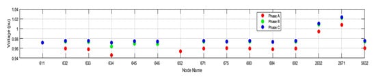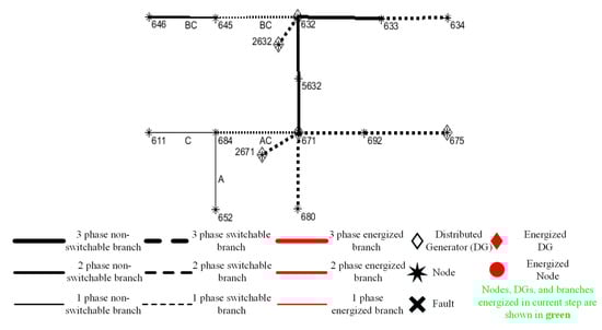 A one-line diagram of the base test system is shown in Figure 10. This test system is made up of two three-phase droop-controlled DGs at nodes 2632 and 2671, and three single-phase PQ DGs at nodes 632, 671, and 675. The system is assumed to have experienced a blackout following the failure of the bulk power grid due to a severe occurrence such as a hurricane; thus, the system was islanded from the bulk system to initiate a black start procedure. In the diagram of Figure 10, the thickest lines are three-phase branches, the medium-thick lines are two-phase branches, and the least thick lines are single-phase branches. Phase information for the two-phase and single-phase branches has been shown as well.