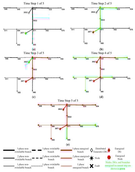 For the restoration sequence of Figure 11a–e, only the restoration of the nodes, branches, and DGs have been shown; the restoration steps of the loads is shown in Table 3. The restoration starts in Figure 11a with the energization of the droop-controlled DG at node 2671. Nodes, DGs, and branches energized in the current step are shown in green. In Figure 11b, which is the second step of the restoration, the switchable branch between nodes 2671 and 671 is energized, which then automatically energizes the non-switchable branches connected to node 671 and their corresponding nodes (i.e., nodes 5632, 632, and 633). This is following the topological and sequencing constraint. In addition, during this second restoration step, the PQ DGs at nodes 671 and 632 are energized.