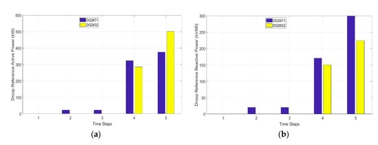 - The active and reactive power reference settings of all droop DGs should remain the same as the previous time step just before the synchronization step, and the DG that is about to be synchronized to the system should do at zero power reference settings (Equations (20) and (21)). Equations (20) and (21) also ensure that the synchronized DG is connected with a zero reference power since its reference power at the previous step would be set to zero according to the DG operation constraints.