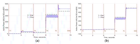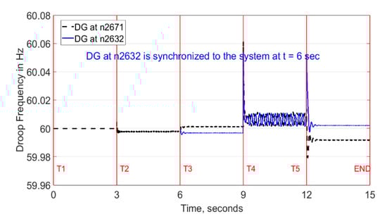 Figure 15 shows the droop reference active power for the two droop-controlled DGs. The red vertical lines are used to denote the time steps: T1, T2, etc. DG at node 2632 was synchronized to the microgrid at 6 s using the proposed zero-dispatch synchronization method. Notice that the synchronization is smooth. There is a sustained oscillation at the start of step 4. This sustained oscillation is mostly a function of the controller parameters. Readjusting these parameters to realize an exponentially stable step will involve detailed controller analysis and will be a focus for future study. By the start of step 5, the system became exponentially stable once again. Figure 15 shows that the droop DGs are able to track their reference active power setting across the restoration steps.