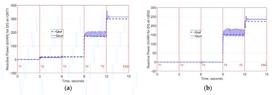 Droop reference reactive power and output reactive power for DGs at nodes (a) 2671 and (b) 2632 as obtained from PSCAD simulation.