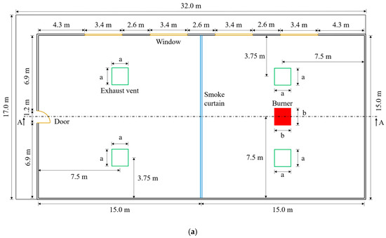 Table 3 shows the operational conditions of the door, windows (open or closed), and smoke curtain (with or without), type of exhaust system, HRR from the burner and dimensions of the exhaust vents (a) and of the burner (b) for each of the twelve simulated cases.