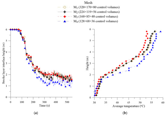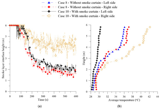 At a given instant of time, the smoke layer interface height below a given exhaust fan was established when the soot mass fraction at a given measurement point reached the value of 10−6. Thus, for cases in which there is no smoke curtain (cases 1–8, 11 and 12), the smoke layer interface height was obtained from the arithmetic mean of the values found for each of the four measurement columns. For cases with a smoke curtain (cases 9 and 10), there are two different smoke layer interface height, each obtained from the arithmetic mean of the values found for each of the two measurement columns located on each side of the compartment’s smoke curtain.