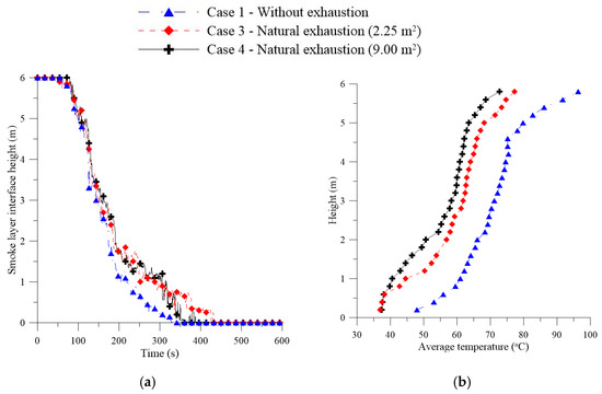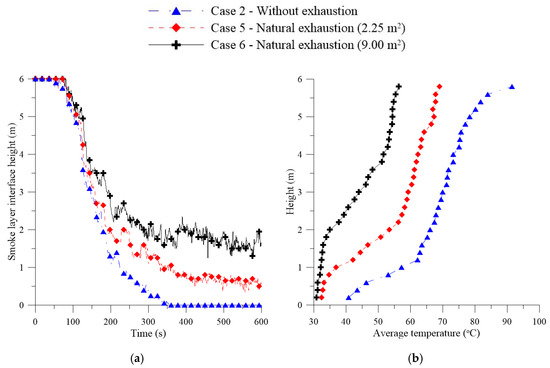 After analyzing Figure 7a, one can observe that, for the well-ventilated compartment (with open windows), the area of the exhaust fans significantly influences the smoke layer interface height, the temperature profile and the average exhaust volumetric flow rate.
