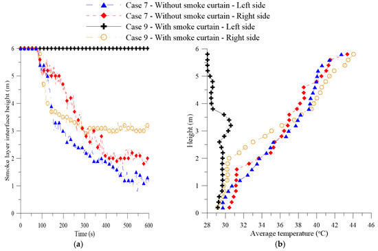 Yuen et al. [17] used the FDS software to numerically evaluate the efficiency of natural exhaust fans and a smoke curtain in an atrium. In this research, the values of temperature and smoke layer interface height were compared with experimental measures reported by Hägglund et al. [36], obtaining good agreement for both cases (with and without a smoke curtain). The authors observed that the smoke curtain is efficient to compartmentalize the smoke, as long as its height is sufficient to completely block the spread of smoke to the other side of the environment.