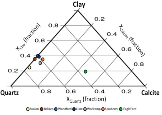 9]. Our dataset only samples these formations at one locality for each formation so is not meant to be representative of these formations over a wide geographic area. For our dataset, the Spraberry, Wolfcamp, Woodford, and Cline formations have similar composition and pore fluid (volatile oil). The Woodford is somewhat different in that it has no carbonate content and the lowest average porosity of all the formations. The dominant constituent of the Eagle Ford is calcite, and it is the only log in our dataset over a producing gas reservoir. The Bakken has the highest TOC and produces black oil. The Avalon has the highest average quartz content in the dataset.